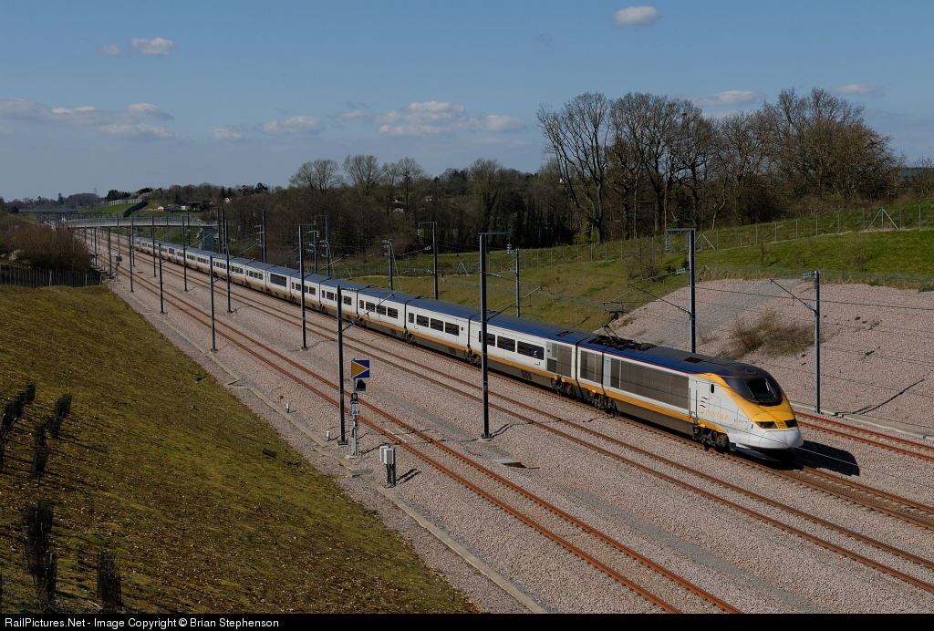 | In the opposite direction to the previous photo British Eurostar set No 373 022/021 passes the four-track Lenham loops on the 13.41 London Waterloo to Paris Nord service. This train has a journey time of 2hrs 42min between captitals. |