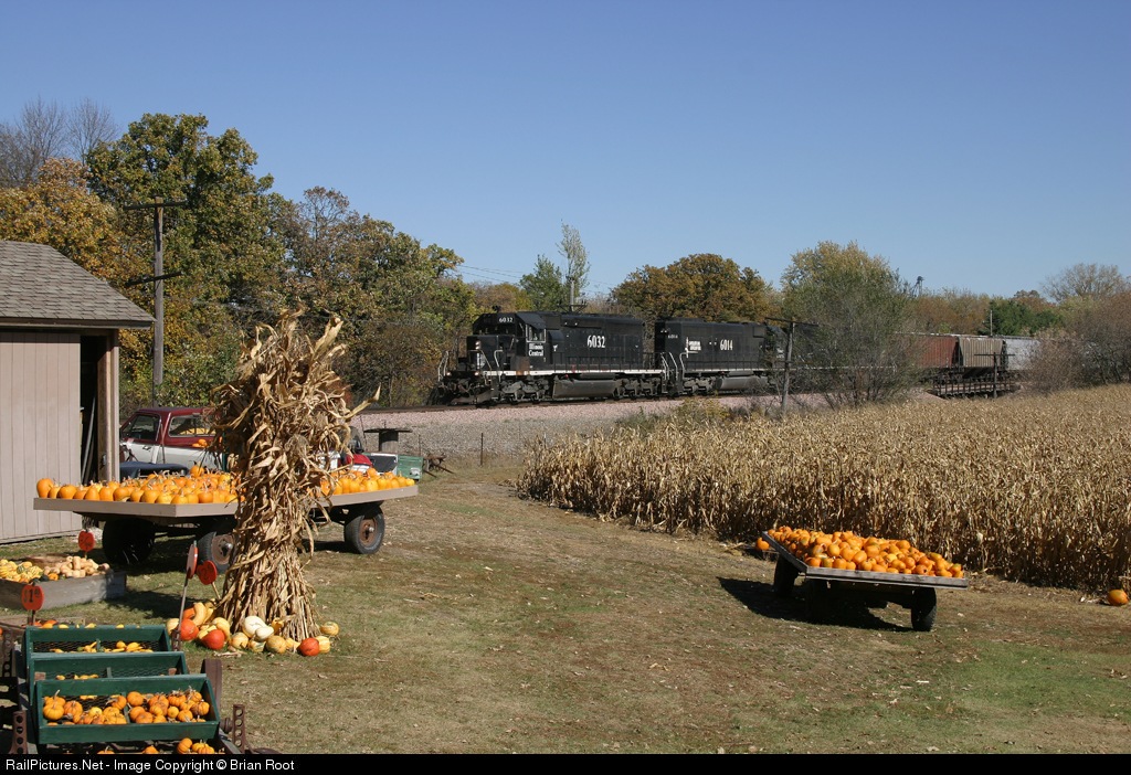 Engineer Craig Williams blasts through a quiet fall scene with a train of empty grain cars bound for elevators in western Iowa.