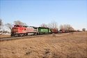 BW40-8 520 and SD40-2 6779 (ex-BN 6779, built 5/77) accelerate ballast loads west out of the hole at Iowa Park after meeting two eastbounds. Time - 1920.