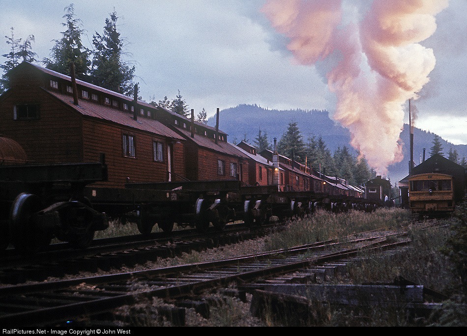 With the first rays of an early morning sun illuminating a split smoke plume, a train of empty log cars pulls into Camp 14 on the Rayonier Hoquiam logging line. Of particular interest in this view are the "camp cars" in the background, mounted on bogies and moved by rail as needed (although I would guess clearances where a challenge). Several of the camp cars have been saved and are at a museum in Tacoma. This is another of my old Anscochromes saved by Photoshop.
