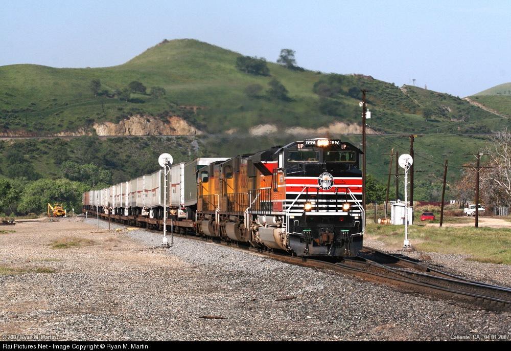 | In "Downtown" Caliente, the UP 1996 is about to hit the West Coast's infamous horseshoe curve as it climbs towards Tehachapi. IIRC, that is the northeastern facing portal of Tunnel 1 can barely be seen in the upper right. |