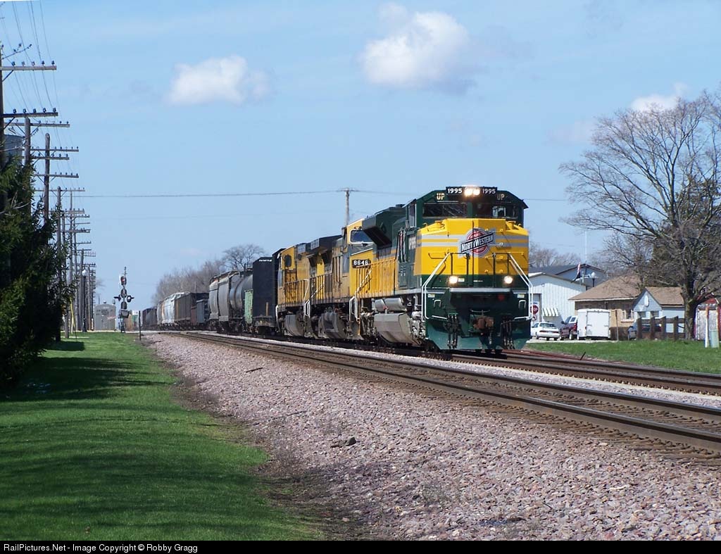 | The CNW trio (UP 1995, the CNW heritage engine, and the CNW Dash 9 duo), highballs through Cortland with MCBPR. |