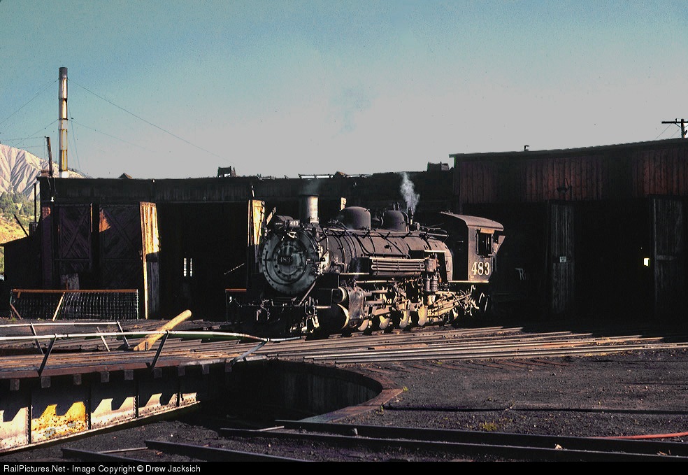 | Simmering outside the Rio Grande's Durango roundhouse, K-36 #483 is ready to take a freight down the Farmington Branch. The roundhouse, once shared with the Rio Grande Southern would burn down some years later and #483 would end up in Chama on the Cumbres and Toltec. |