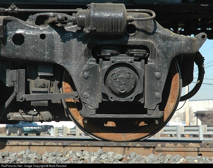 Close-up of Bloomburg truck on NS geep. It still amazes me how such a small flange keeps hundreds of tons on the rails.