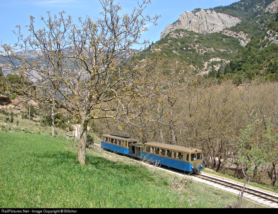 Decauville dmu unit crossing a small valley before Mega Spileo station.