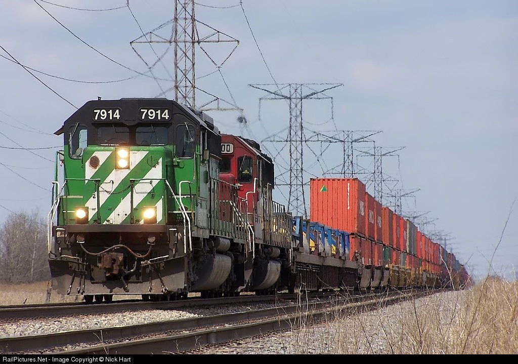 Idling away in the siding is BN SD40-2 7914, along with a very rare visitor - a SOO Line!
