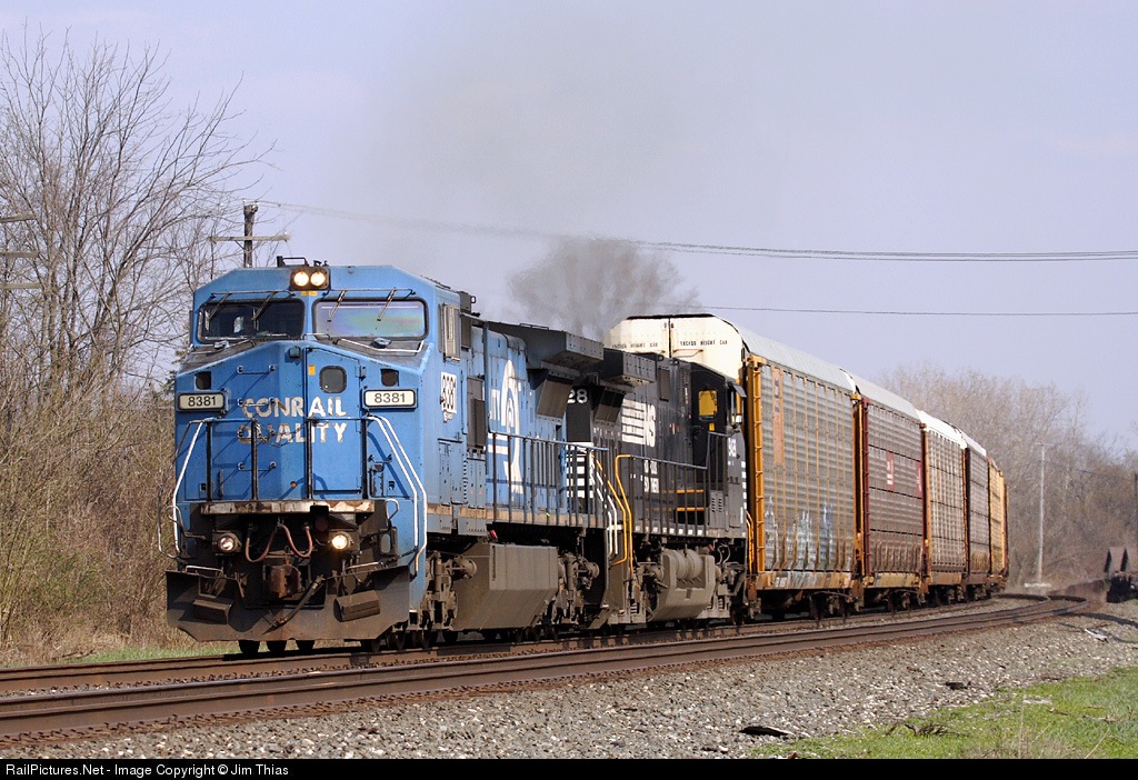 | NS 8381, still in Conrail paint, leads a train of auto racks around the long sweeping curve that intersects Ligonier. |