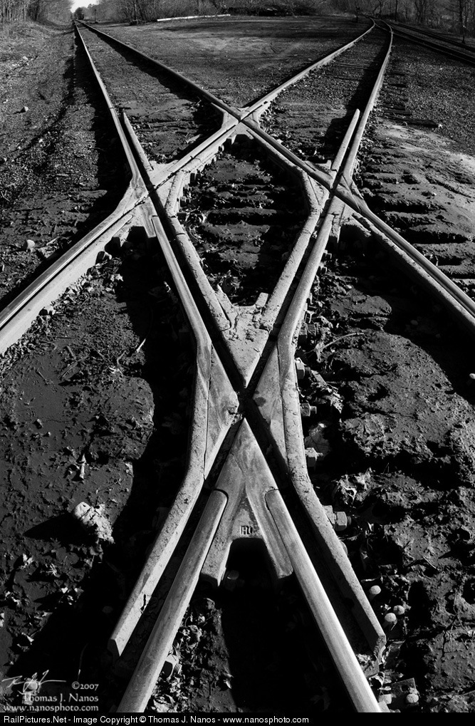 A view of the Providence & Worcester diamond at Plainfield, CT. The P&W Norwich Branch is from the top left to bottom right, and the P&W Willimantic Branch is from the top right to the bottom left. Canon EOS 20D, Sigma 15mm f/2.8 EX Fisheye