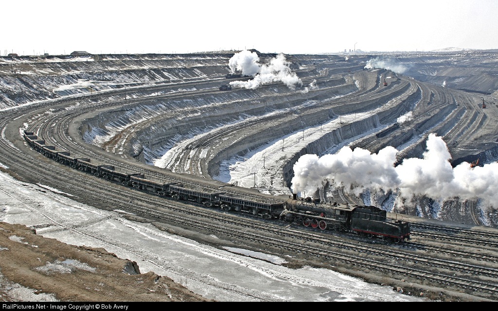 This spectacular opencast mine in Inner Mongloia not far from the Russian border has several interconnected rail levels and is 100% steam worked. Apparently activity was less intense than a few months ago and there are unconfirmed suggestions the mine may be running short of coal.