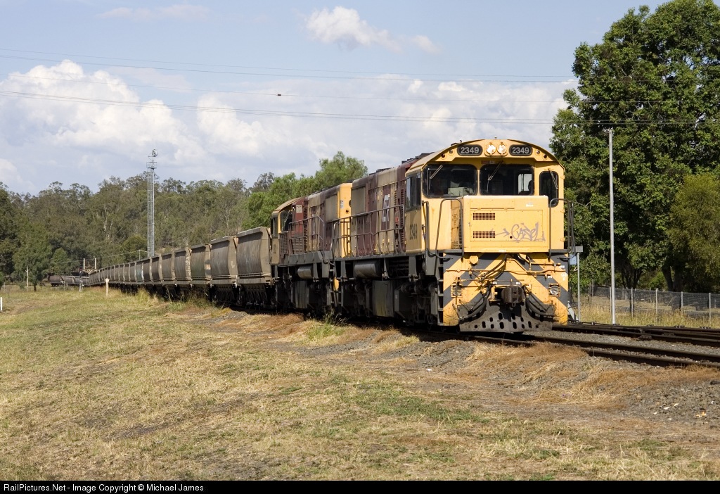 | Coal Train #9Y14 lead by QR 2349/2301 crawls into the loop at Murphy's Creek (in the foot hills of the Great Dividing Range) to cross Steam Train #M915 on a 9-Day ARHS Tour from Quilpie. |