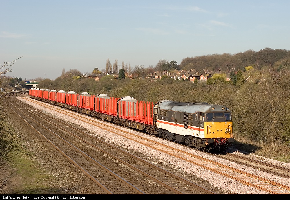 Just after passing the junction at Trowell North of Toton, Mainline liveried 31454 hauls a rake of newly converted timber wagons from the WH Davis wagon works at Langwith to Derby, where a class 57 replaced the 31 to take the wagons forward to Carlisle ready to enter traffic the following day on timber trains for Amec.