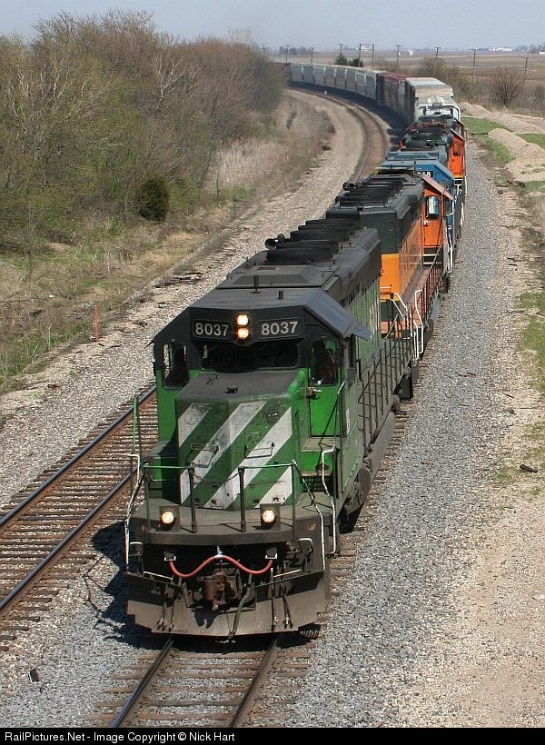 | BN Cascade green SD40-2 8037, a BNSF H1 SD40-2, an EMDX GP38-2 and two more BNSF H1 SD40-2's are at a crawling speed through Ransom. |