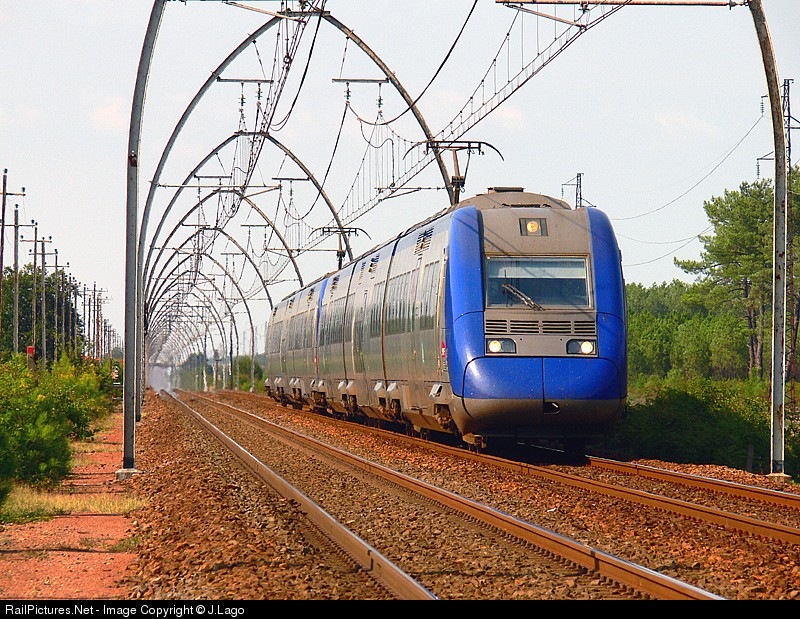| Regional train covering the service between Bordeaux and Dax under the immortelles ogivas MIDI, to 160 km/h in Morcenx's proximities. |
