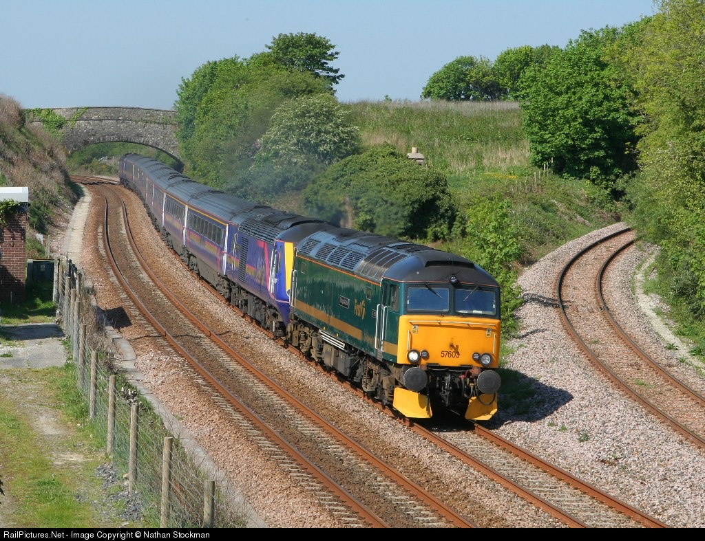 Having worked the night sleeper down to Penzance 57603 was utilised to drag an errant HST set as the 1A88 08:45 Penzance to Paddington as far as Plymouth. The HST set had failed the previous night having required attendance from the fire brigade. Another 'First' Farce!!