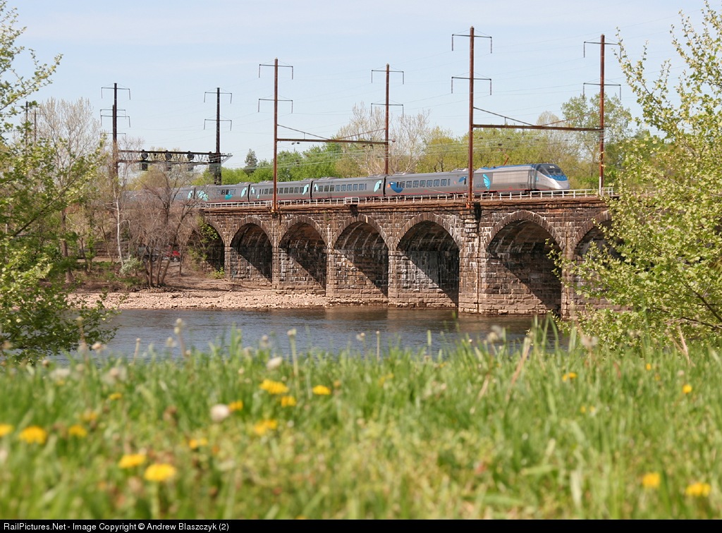 A southbound Acela crosses the Delaware River into Pennsylvania on a beautiful spring morning.