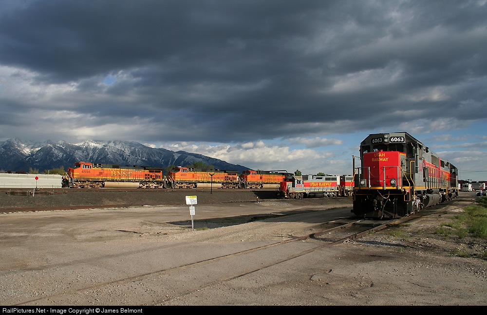 Under stormy skies, a BNSF Denver-Riverbank freights rolls west while Utah Railway power awaits it's next assignment.