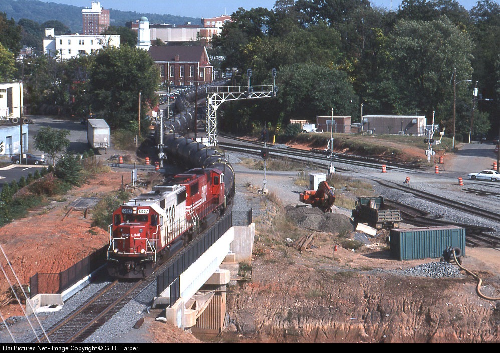 Two Soo Line units in two schemes take a winding sulphur train westbound through Charlottesville. Realignment of both CSXT and NS visible due to underpass construction at both railroads.