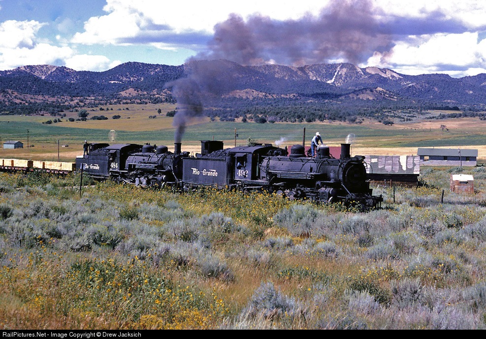 Working East out of Durango, #492 (K-37) and #484 (K36) are passing thru Bayfield. The crew has found #492 does not have enough sand and the fireman is on top of the boiler pushing what little he can find to the bottom of the dome. A pick-up would be sent out and sand put in the engine via bucket brigade.