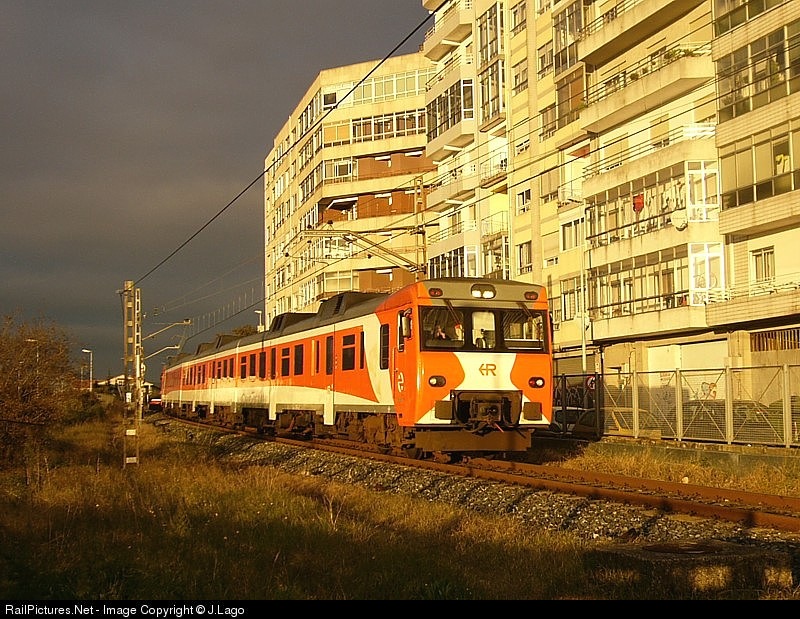 | Regional train proceeding from La Coruña to the step along the suburbs of Vigo covering a regional service during one winter evening with an interesting putting of the sunset and threatening storm. |