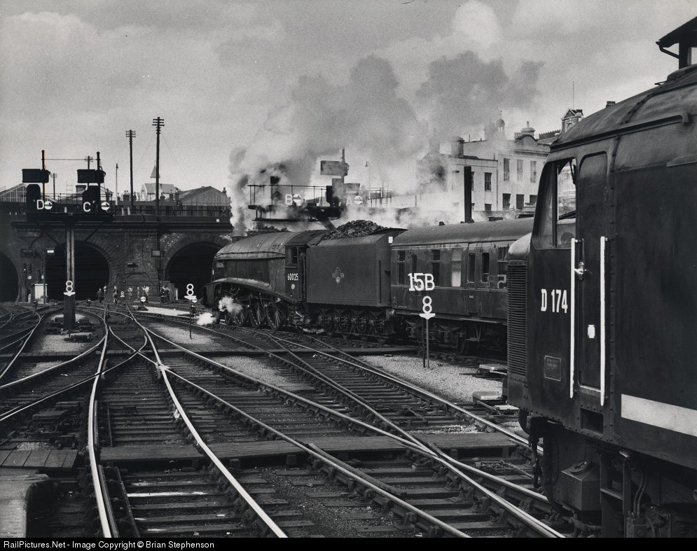 | Transiition from steam. A4 Pacific No 60025 'Falcon' is about to enter the Gasworks tunnel as it leaves Kings Cross with the 15.10 to Newcastle via Sunderland train. Class 46 No D174 waits in the foreground with the 15.20 to Leeds & Bradford. |