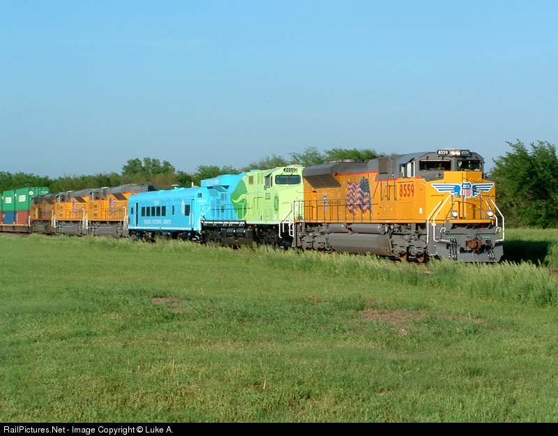 UP 8559 with 3 of its counter parts have a special addition the new GE Hybrid unit with its test car.
