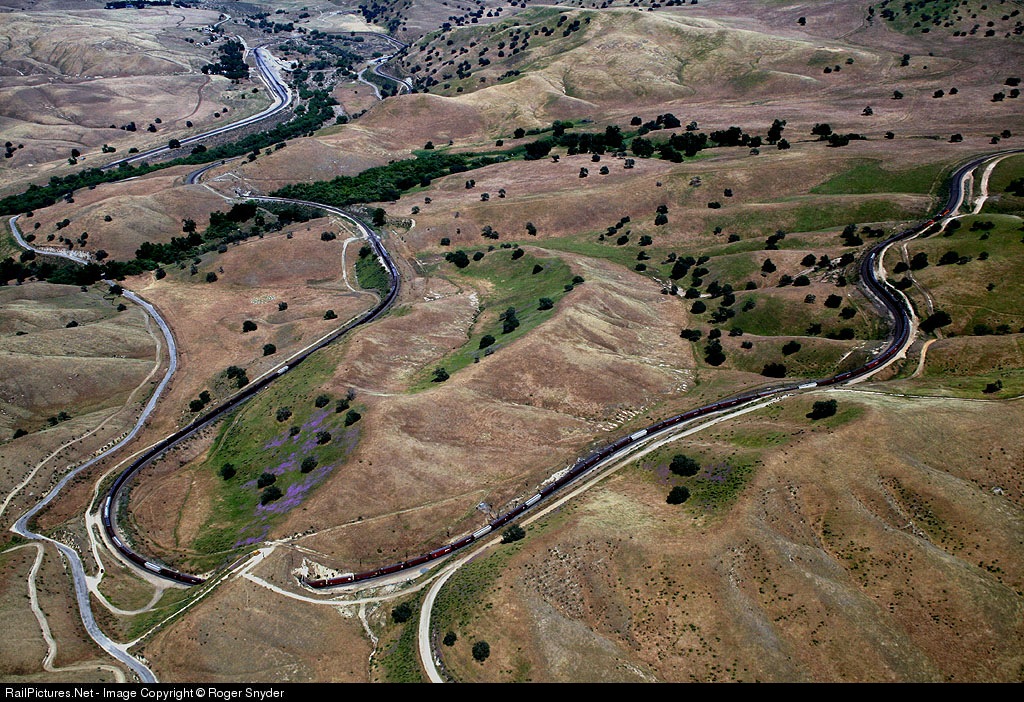 Southbound empty grain train loops through tunnel two between Caliente and Bealville, CA beginning its assault on the Tehachapis. The horseshoe curve down at Caliente and tunnel 1 are in the upper left of this picture. This is the second of five horseshoe curves necessary to get heavy tonnage up the mountain to the high desert.