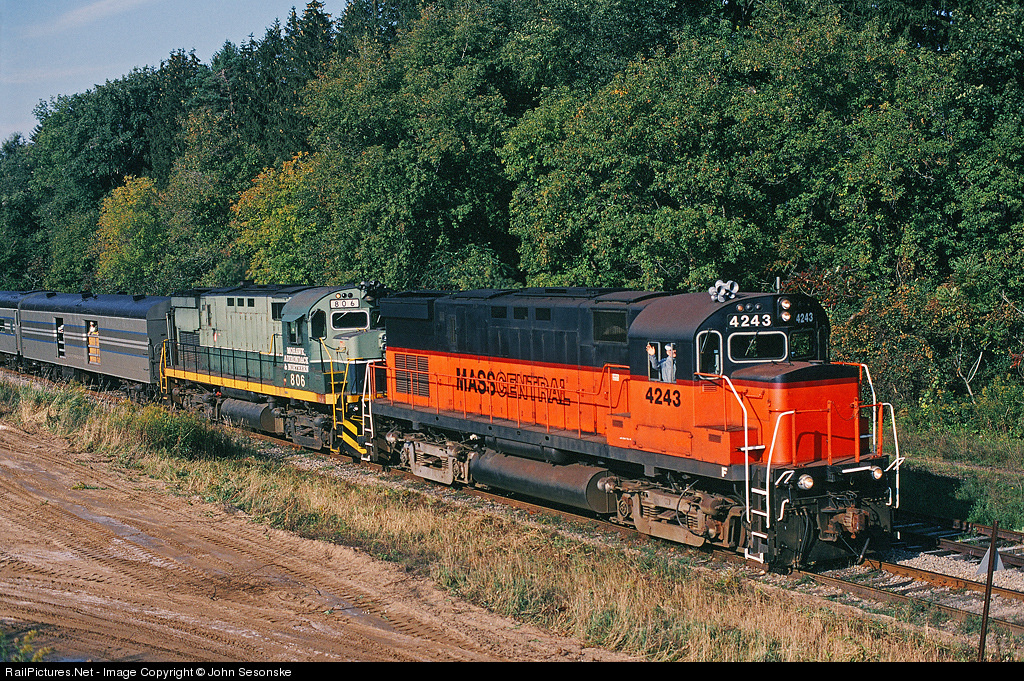 The Adirondack Scenic Railroad morning train from Utica to Thendara rolls NB on Mohawk, Adirondack & Northern trackage with lead engine still in previous owners paint. Trailing unit is Mohawk, Adirondack & Northern C425 # 806. Location is where tracks go over NY Rt 12 at the Town of Trenton Highway garage. Elevation thanks to winter stock sandpile.