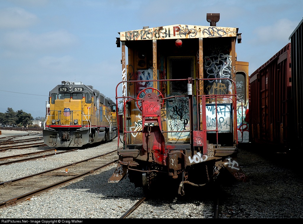Union Pacific GPs 579 and 1014 sit in the middle of the yard in Oxnard, CA on May 20, 2007. Bay-window caboose 25831 has, unfortunately, become a "canvas" for the local taggers.