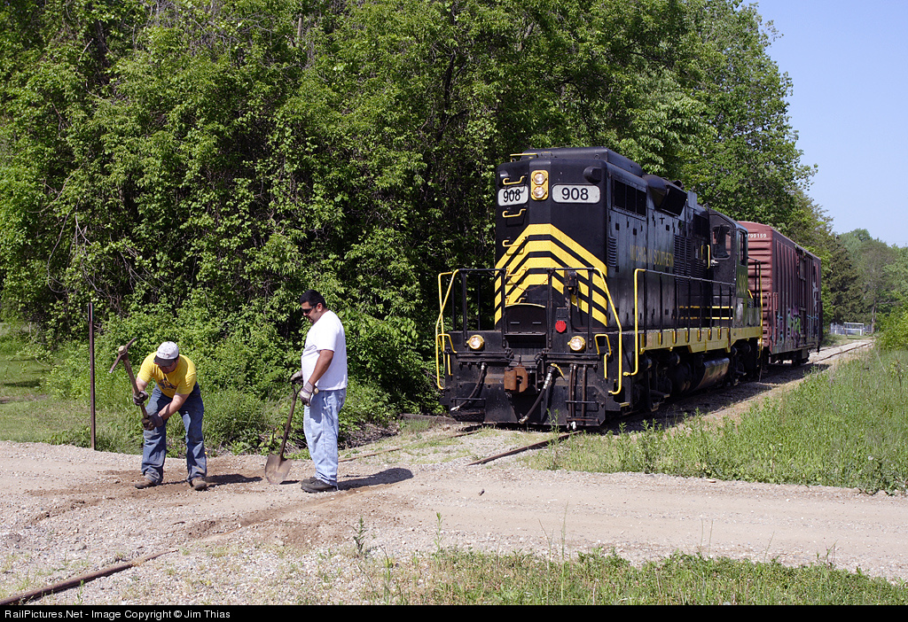 Michigan Southern 908 goes on a short run between Hartford and Paw Paw, Michigan, about once a month. During that time, it's easy for the unpaved crossings to become covered with packed dirt due to rain-washed soil and traffic. The morning started out as a relaxing short run, but quickly turned to hard work as the engineer and conductor used a pick-axe and shovel to clear the rails.