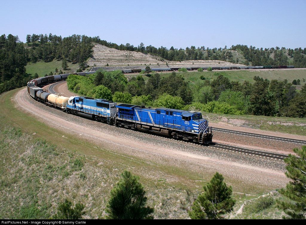2 blue motors lead the DM&E interchange train down Crawford Hill. Most of the consist of the train will go east on DM&E's ex CN&W line later that evening.
