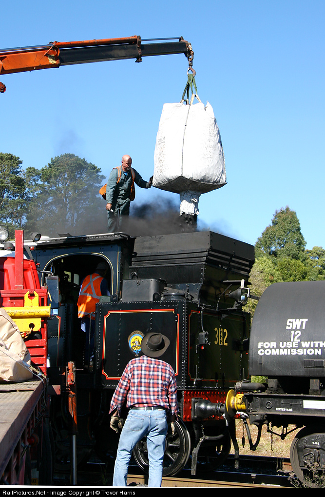 3112 Takes on coal from bags load from a Flat top truck at Robertson Station
