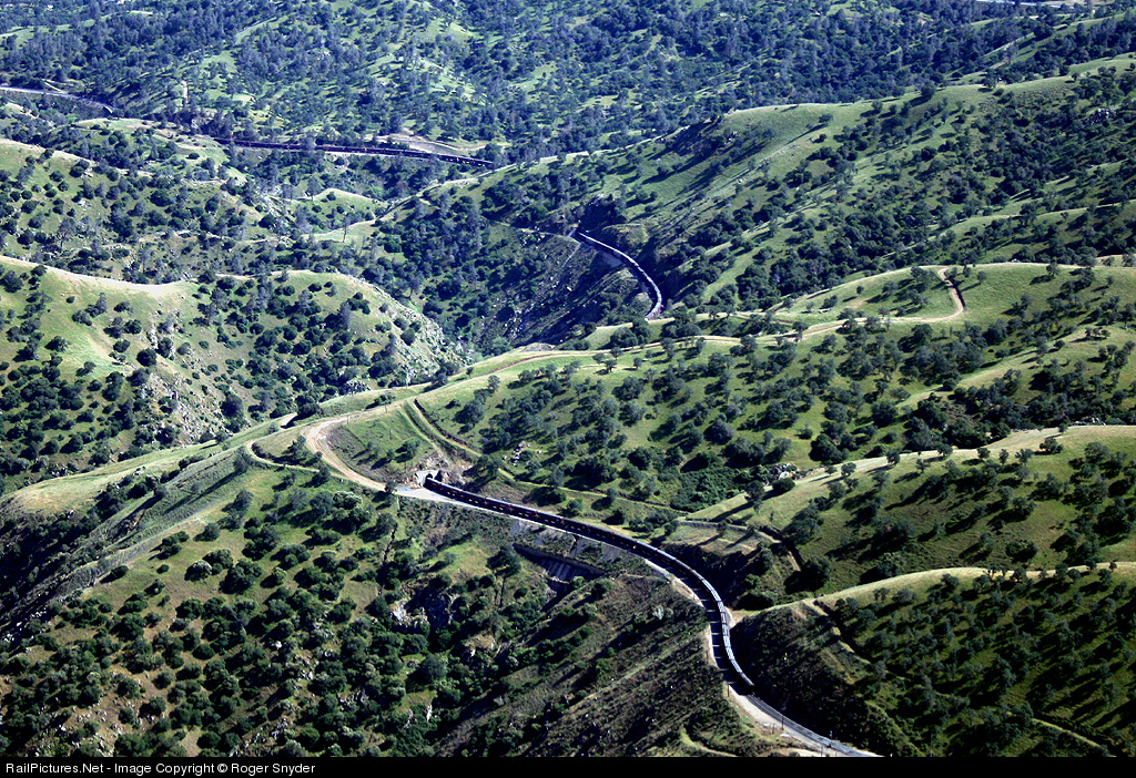 Empty grain train snakes through tunnels 7 & 8 between Cliff siding (lower right) and Rowen siding (upper left) on a section of mountain railroading seldom seen by railfans. This topography generally faces northeast, thus the green look, while south and west slopes are rapidly turning brown.