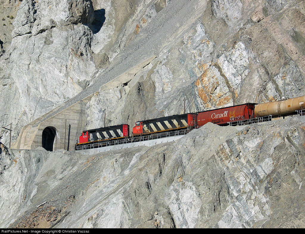 | Remarks: CN 5350 and CN 2408 elephant style make their way through the rock sheds at Lasha (White Canyon) on the CN Ashcroft Sub, Oct 22, 2006 towards the Pacific Coast. |