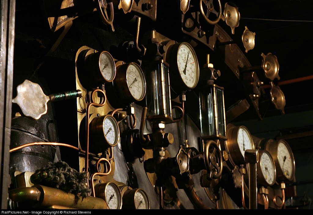 Burnished brass and copper in the cab of a 25NC class as it simmers overnight in Ficksburg station at the head of its photographic charter train.