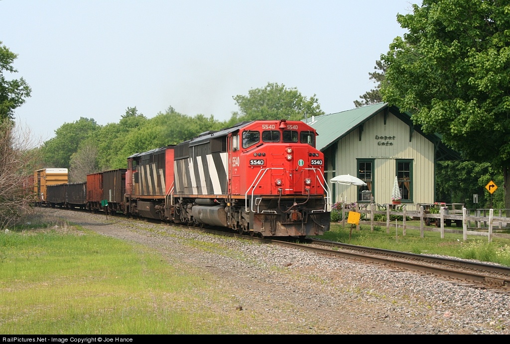 CSX Q62031 passes the former New York Central station, now the Depot Cafe. CN 5540 looks a little odd without a CN logo.