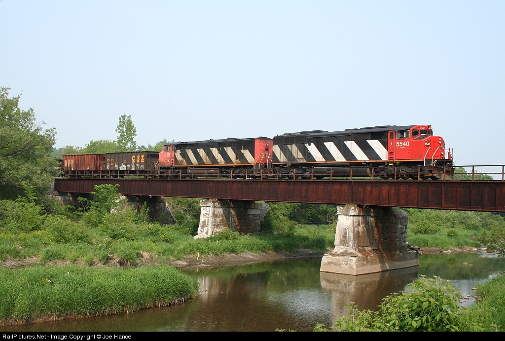 CSX Q62031 crosses Sandy Creek on a hot hazy spring day. CN 5540 looks a little odd without a CN logo.