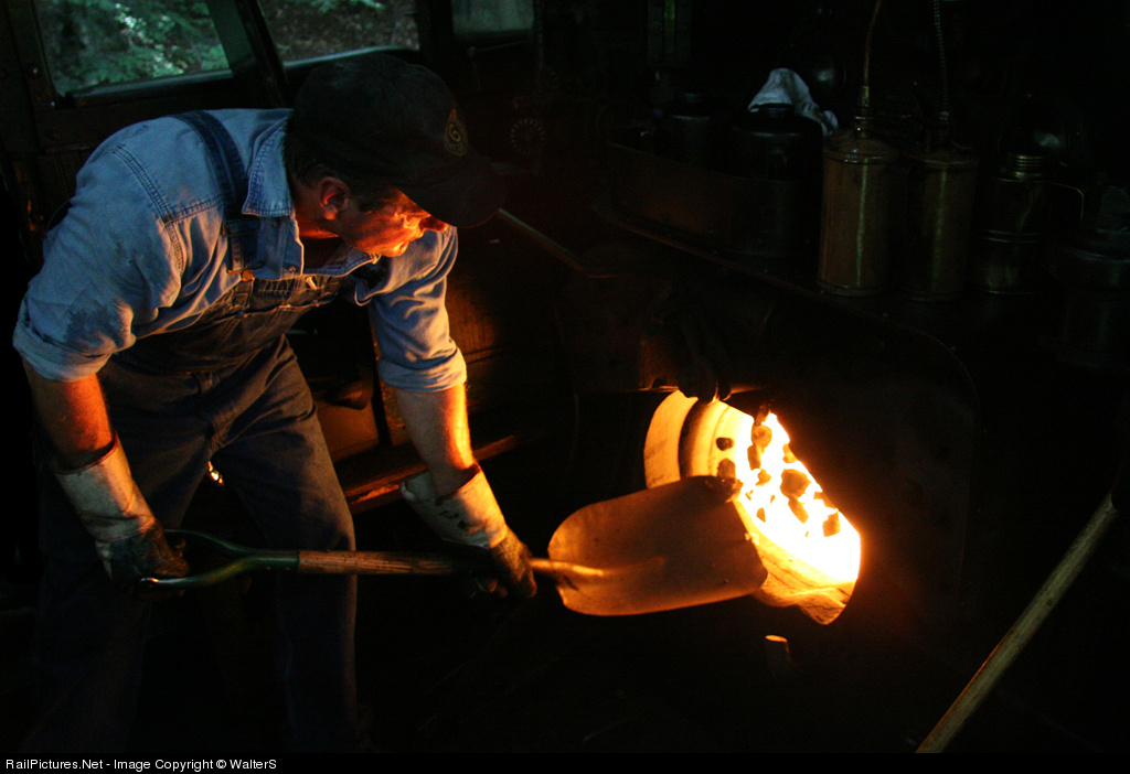 The glow from Shay #6 firebox lightens the face of Gary Cassell as he shovels coal into #6.