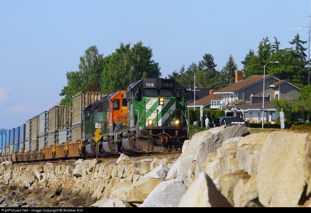 | BNSF 7018 leaves the siding at MP 18 after waiting for a Sounder Commuter and Amtrak Empire Builder. It is a garbage local and the train is full of garbage, so it STINKS!! |