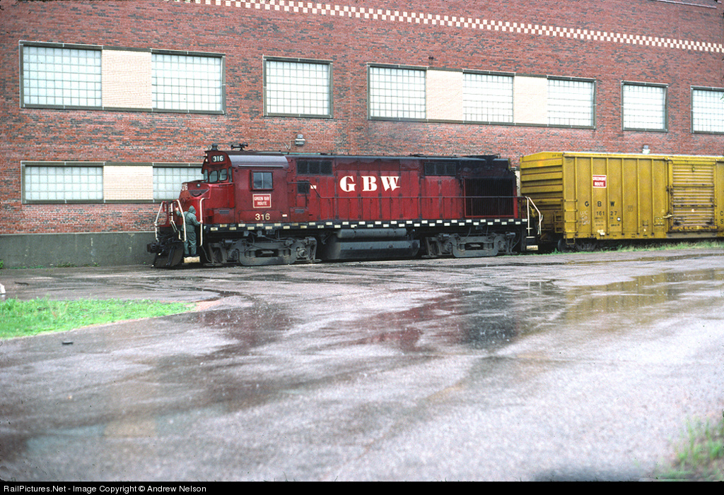 The crew on the Plover Way Freight had to employ some creative switching moves, including Dutch drops, when it worked the CP's Stevens Point Mill. On a rainy June afternoon, the #316 backs out of the mill complex to the "P Line" for the trip back to the GB&W main at Plover, 5 miles south.