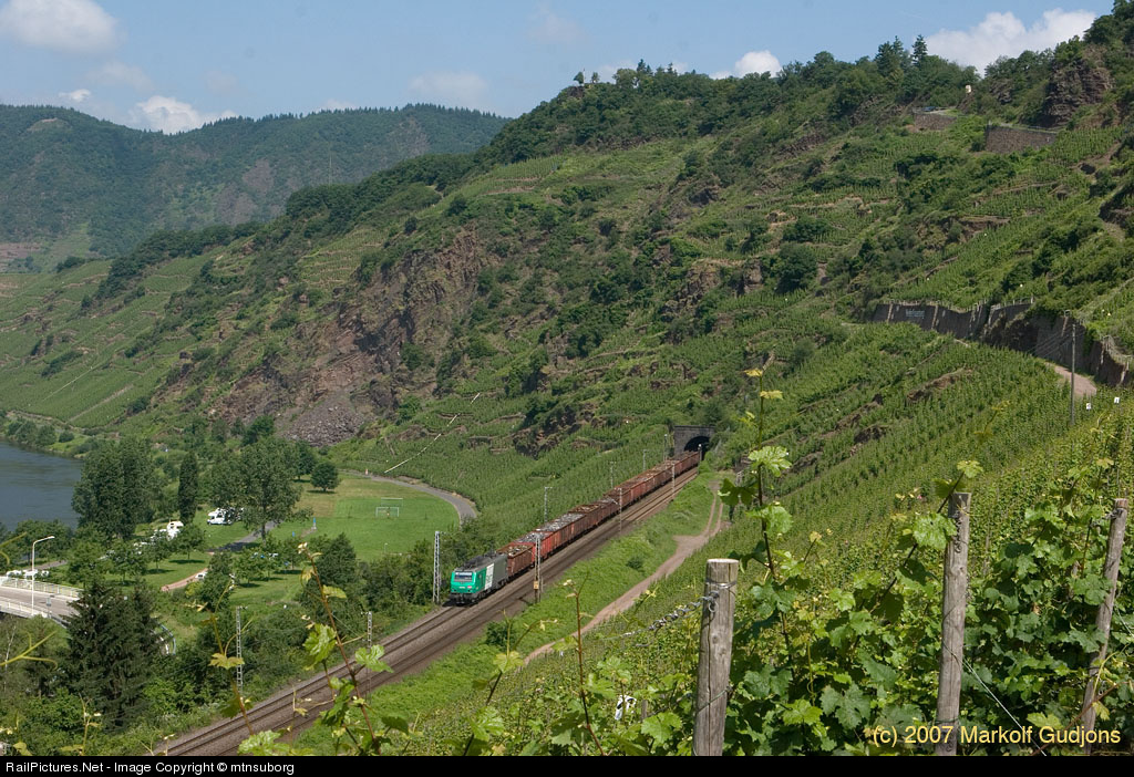 A French Alstom Prima leads an international freight upriver through the vineyards in the Mosel valley.