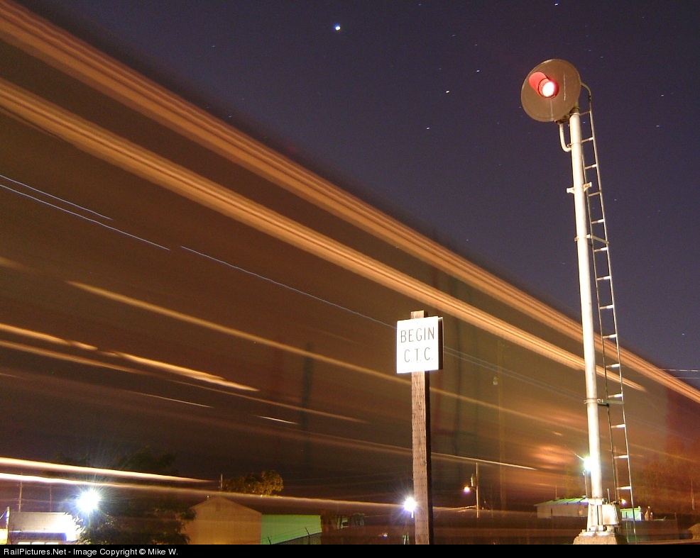 | BNSF 9211 leads a lengthy mixed freight featuring BN, ex-ATSF, and BNSF power past the Searchlight signal in Valley Park, MO. on this starry night. |
