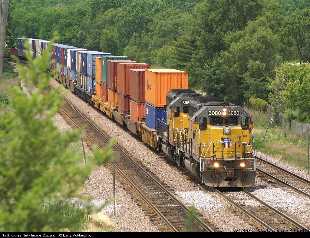 | Waiting for traffic to clear, the UP 3080 holds #2 MT at Wheaton, IL |