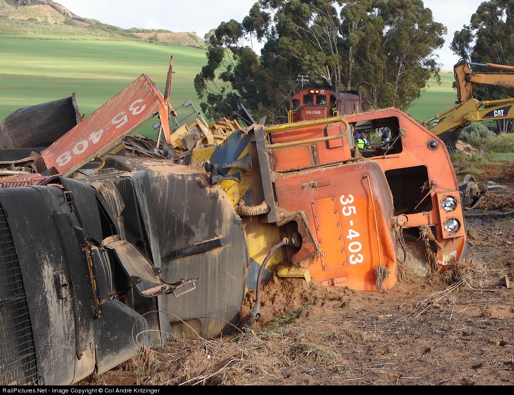 | In April 2004 I had the privilege of a cab ride across Sir Lowry's Pass in 35-408. Not much room left in that cab now after 35-403 ploughed into it during the accident on 7 June 2007. The accident was caused by a track washout during heavy rain. |