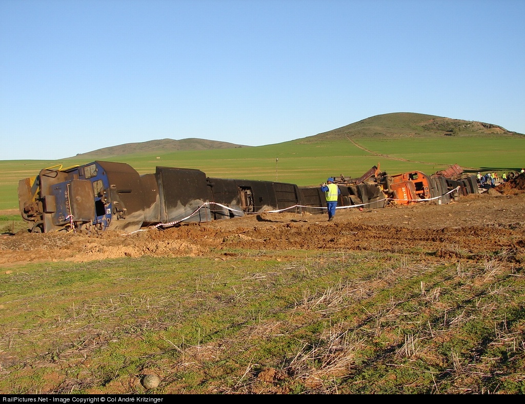| Six days after the 7 June derailment, conditions have finally dried up enough for the wreck crews to get new track laid down. The four locomotives are still lying where they fell. |