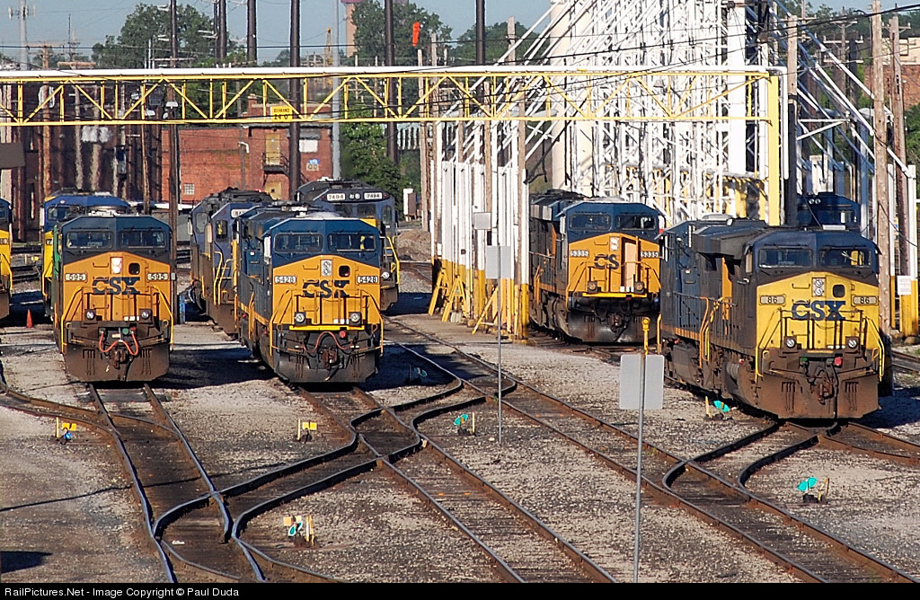 The engine pit at Collinwood shows many modern day widecabs. CSXT 5428 is in the pit, which I caught as the leader on Q100 going east 2 days ago. (Photo ID: 189567)