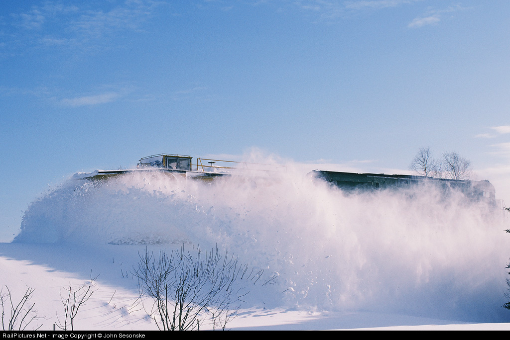 The MA&N operated this plow train to clear the line to Lyons Falls the afternoon after the Utica NY area received 3 feet of snow in a single day. Plow is borrowed Conrail single track russell plow CR 64528. Actual location is within the Town of Marcy just south of Stittville.