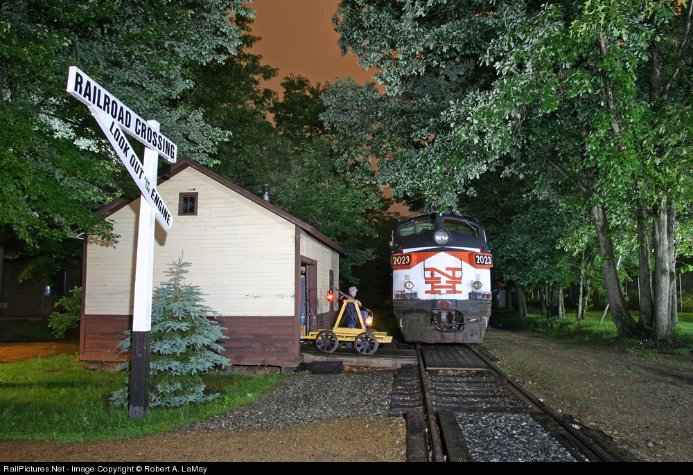FL9 no. 2023 poses in front of NHRR Section House as museum member Robert Hassett observes from the hand pump car in Columbia Junction Village during the museums 4th Annual Night Photo Shoot.