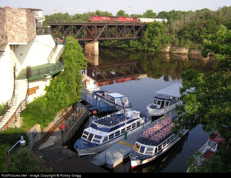 CP AC4400CW 9721 leads 280 east through the Dells, passing over the Dells Boat Toars docks.