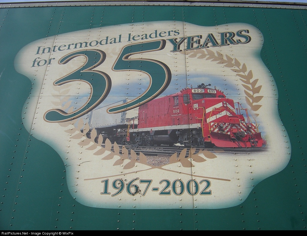 This logo adorns the side of Vermont Rwy. 53' van TDIZ 262549 as the train stops for a crew change far from it's home rails in Needles, California on a day that the temperature reached 118 degrees.