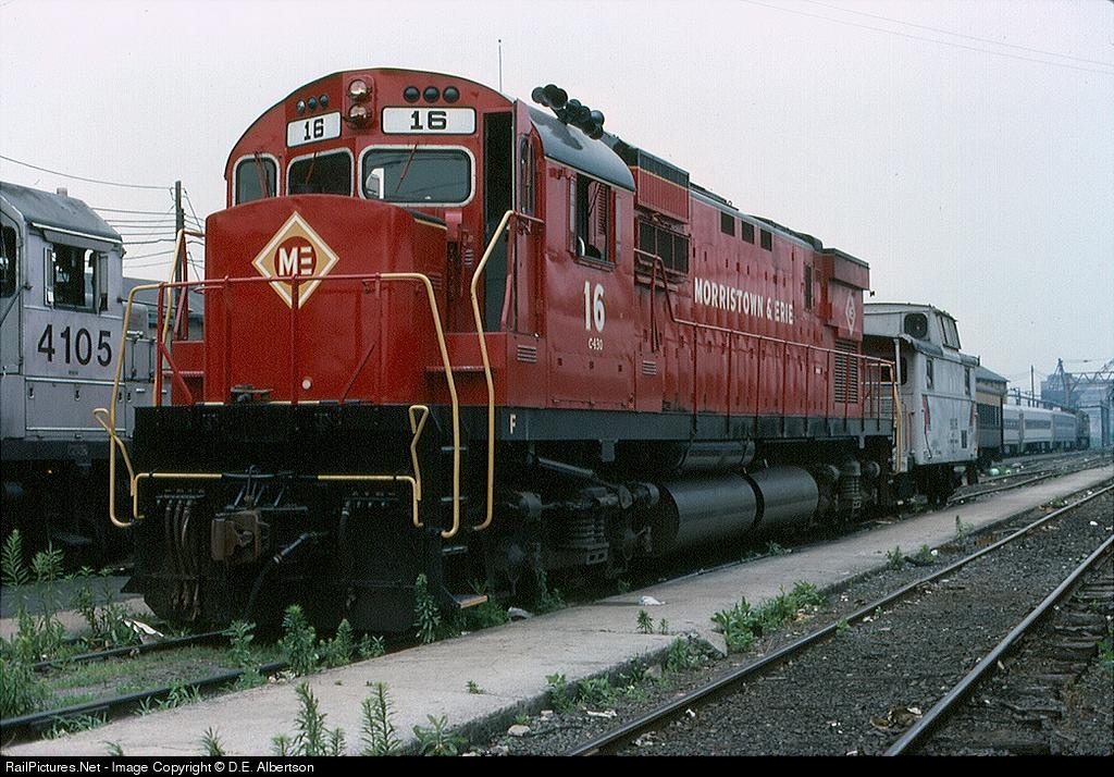 | M&E 16 C-430, leased to NJT for work train service, and caboose 903r. Hoboken Terminal 23JUN88 |